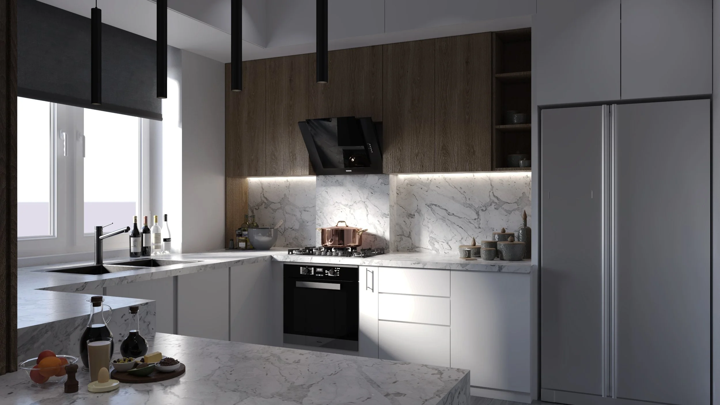 Bar alanında ritmik çizgilerle güçlü bir odak noktası oluştururken, doğal dokular ve koyu tonlarla mekâna sıcak ama sade bir karakter kazandırdım. Her detayı, mekânın atmosferini yalın ama etkileyici bir dille anlatacak şekilde düşündüm.
